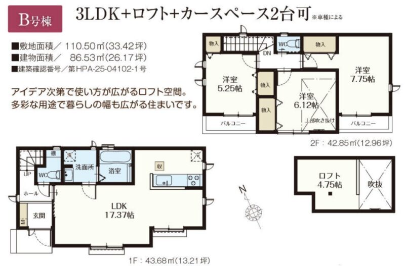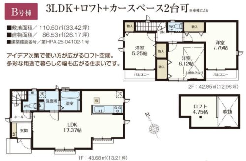 【B号棟】3,950万円 土地面積:110.50㎡ 建物面積:86.53㎡